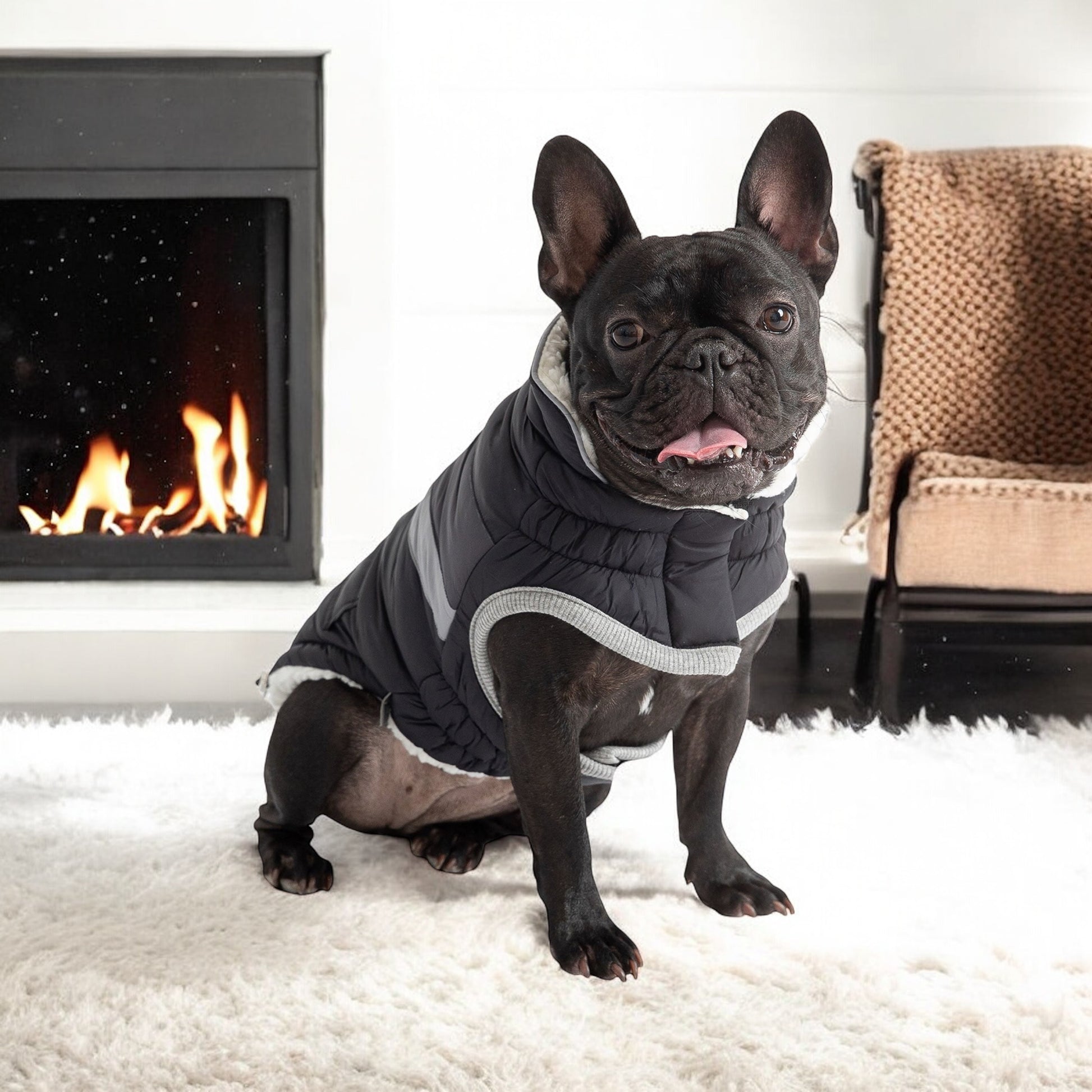 - With GF Pet signature contrast piping and snuggly-warm, popcorn Sherpa lining, the Alpine Puffer keeps it real. Water repellent and super-adjustable, with patented Elasto-Fit technology, this coat is designed to keep dogs looking cool while staying warm.