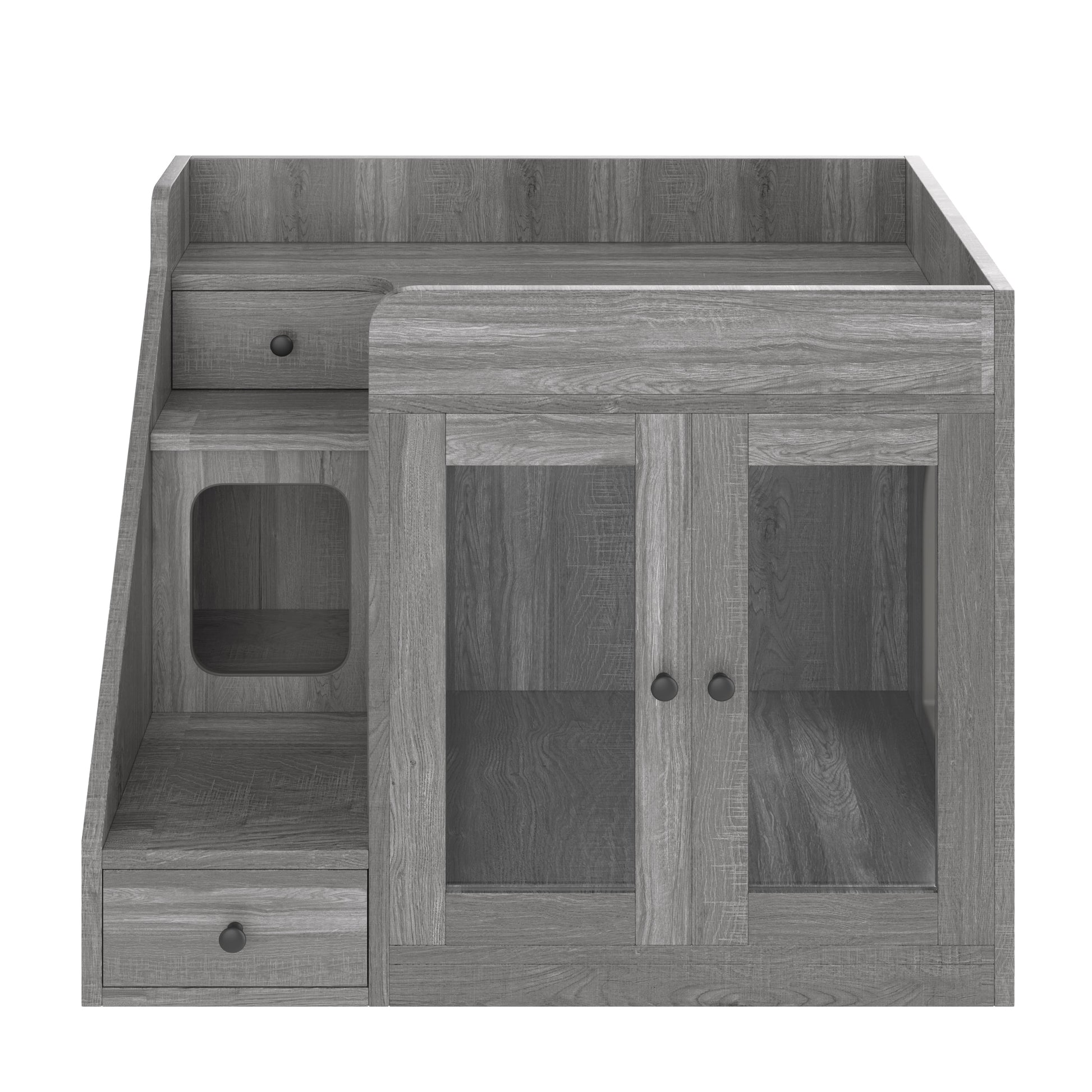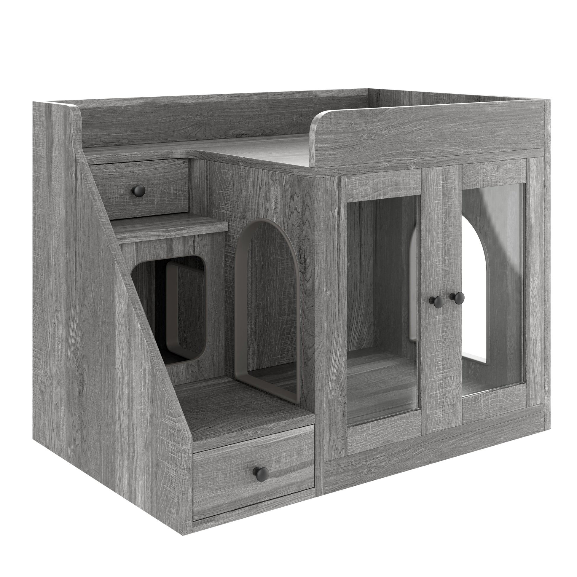 - The expansive top surface doubles as an elegant resting area for your cat or an attractive display spot for decorative photo albums and potted plants. Three inviting side stairs lead your cat to a playful and cozy space inside, creating a mini-adventure every day. Underneath these stairs, cleverly designed drawers offer extra storage for toys, treats, and litter box accessories.
