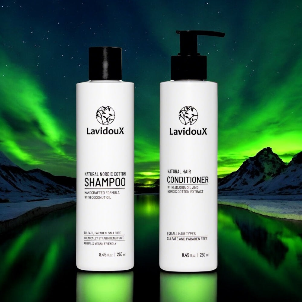 Revitalize Your Hair Naturally Elevate your hair care routine with our Natural Hair Revival Kit—a shampoo enriched with Nordic Cotton Extract & Coconut Oil paired with a conditioner featuring Nordic Cotton Extract & Jojoba Oil.