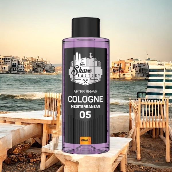 - The Shave Factory After Shave Cologne 05 Mediterranean 16 oz is a premium grooming product designed to provide an exceptional post-shave experience. This product offers the best of both worlds: it soothes and protects your skin after shaving while also enveloping you in a refreshing, long-lasting fragrance inspired by the sun-drenched shores of the Mediterranean. The 16 oz size ensures that you have plenty of this luxurious product to last, making it a valuable addition to your daily grooming routine.
